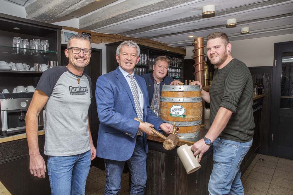 Tiefschwarz, vollmundig, mit Schokoladen- und Kaffeenoten und einer wärmenden Wirkung, die lange bleibt: das ist das neue Zapfenduster Imperial Stout, der jüngste fränkisch-brasilianische Gemeinschaftssud von Roland Kundmüller und Alexandre Bazzo von der Cervejaria Bamberg in Brasilien. Und weil so ein besonderes Bier natürlich auch besonders präsentiert werden muss, wurde das erste Fass nun offiziell von Landrat Johann Kalb angestochen.