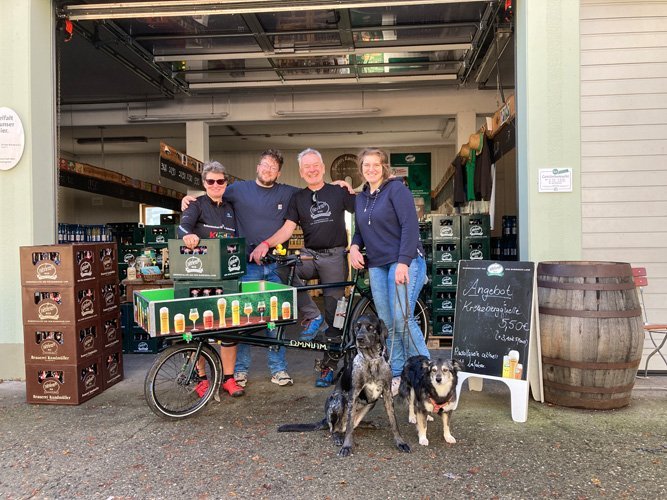 Als die neue Box fertig war, kam Erhard dann mit seiner ganzen Familie nach Weiher zum Bockbieranstich - natürlich mit im Gepäck: das Lastenrad (und auch das seiner Frau Anja.) Zusammen mit dem Weiherer Team feierten sie daraufhin das schöne Rad und die frischen Böcke. Während Tochter Jana und ihr Verlobter Lupo dann noch ein paar Tage in Weiher blieben, machten sich Erhard und seine Frau auf den Rückweg mit den Rädern. Ganze 715 Kilometer sind es von Weiher nach Kerpen. Das Ankunftsbier hatten sich beide dann redlich verdient.