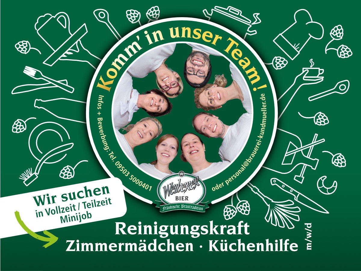 Wir brauchen für die Biergartensaison dringend Unterstützung. Werde DU Teil vom Weiherer Bier-Team im Brauerei-Gasthof Kundmüller! Wir brauen bei uns nicht nur mehrfach ausgezeichnete Bierspezialitäten, sondern überzeugen auch mit fränkischer Küche, idyllischem Biergarten, Biermuseum, Kinderspielplatz, Streichelzoo, Gästezimmern und bierigen Ferienwohnungen und einem wirklich tollem Team! Wir freuen uns auf deine Bewerbung, entweder per mail an personal@brauerei-kundmueller.de oder unter 09503 5000401 oder klicke einfach hier.