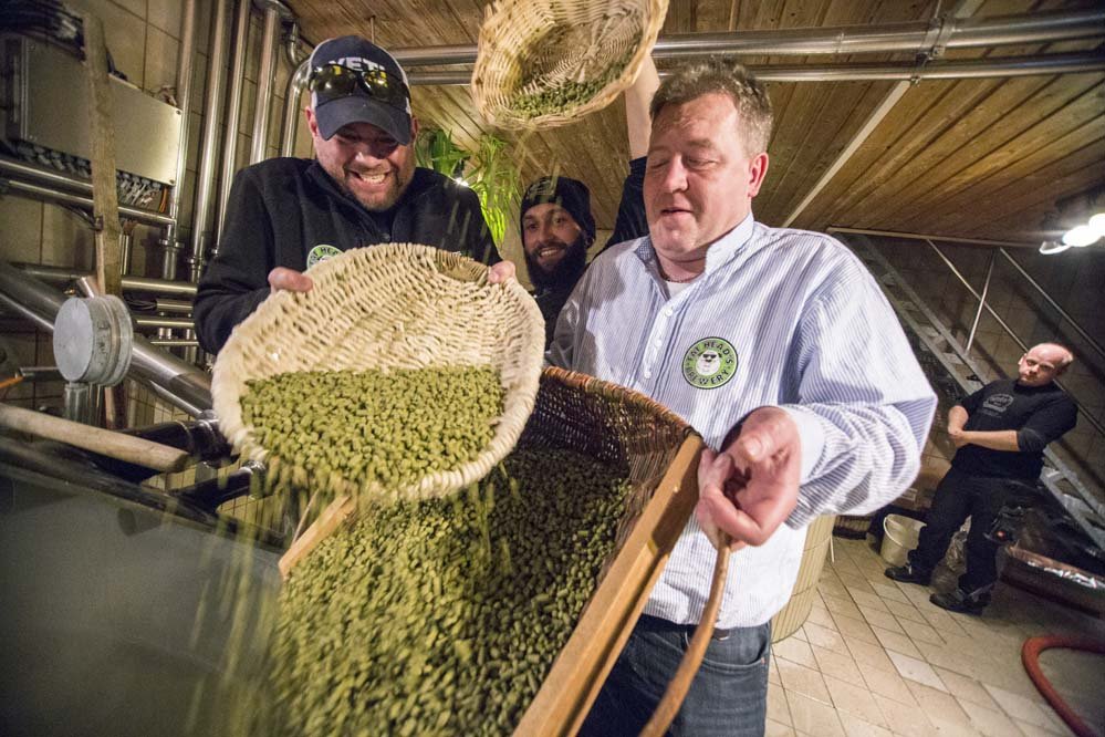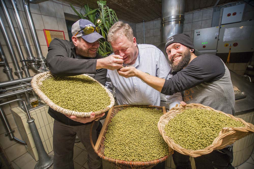 Franken, Amerika und der Hopfen. Die Brauereien Kundmüller aus Weiher und Fat Head’s aus Ohio haben bereits mit ihrem gemeinsamen Imperial IPA gezeigt, dass das gut zusammen passt. Jetzt flog Braumeister Matt Cole erneut ein und braute zusammen mit Roland Kundmüller und seinem Team ein Bier - das Hopferla, ein West Coast Style India Pale Ale mit den sieben Hopfensorten Simcoe, Warrior, Centennial, Mosaic, Equinox, Citra und Chinook sowie klassischen und Karamell-Malzen.