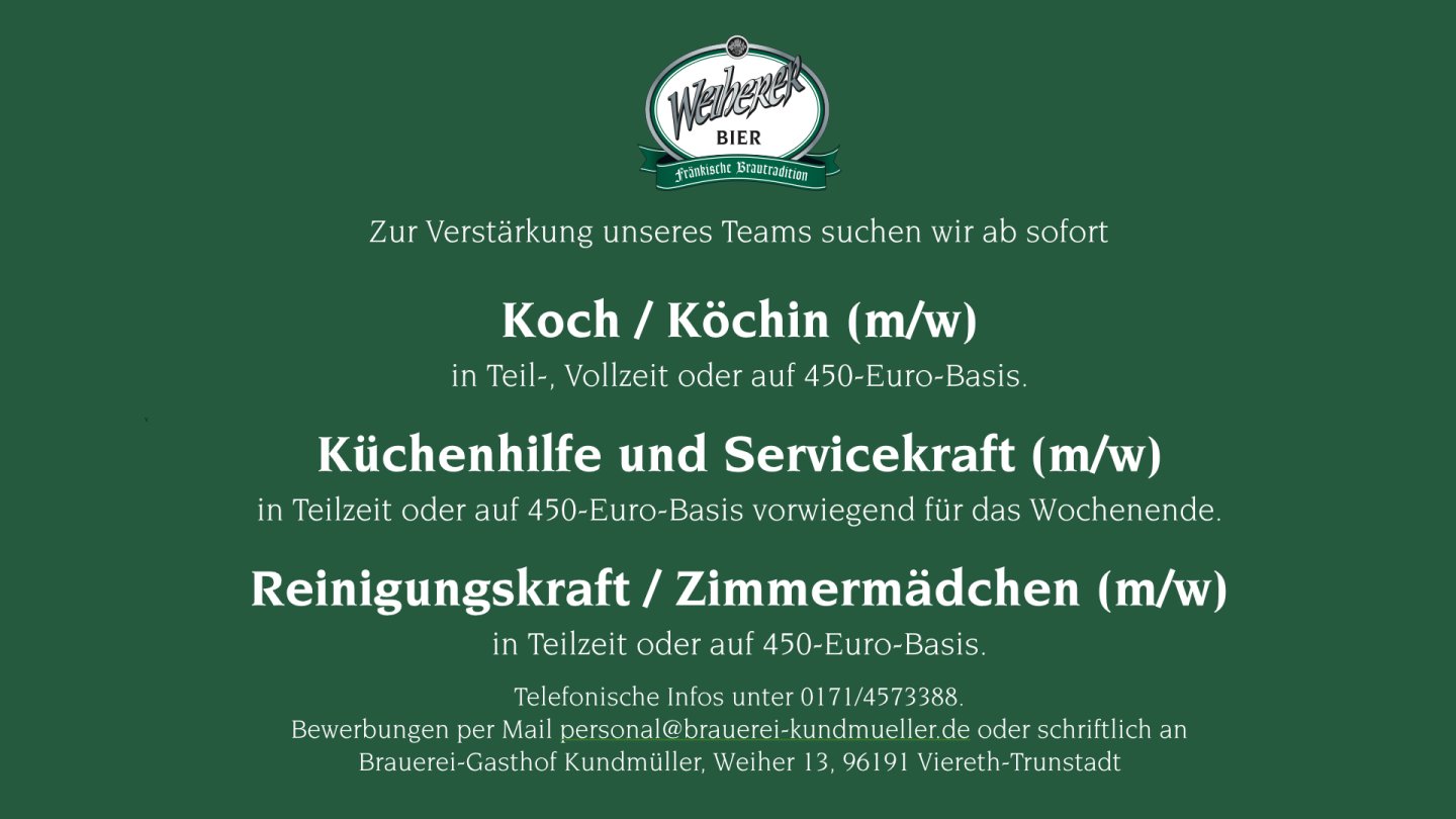 Telefonische Infos unter 0171/4573388. Bewerbungen per Mail personal@brauerei-kundmueller.de oder schriftlich an Brauerei-Gasthof Kundmüller, Weiher 13, 96191 Viereth-Trunstadt