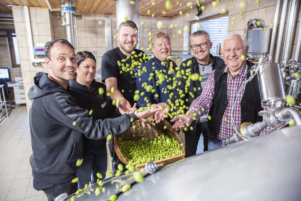 Beim öffentlichen Schaubrauen konnten sich die Gäste dann auch gleich überzeugen, dass der künftige Name des Bieres, das ab Ende Oktober erhältlich sein wird, Programm ist. Denn „Zapfenduster“ steht für die tiefschwarze Farbe des Imperial Stouts, was in den Kesseln deutlich zu erkennen war. Gemeinsam mit dem stellvertetenden Landrat Johann Pfister zupften Alexandre Bazzo und die Kundmüller Brüder dann frischen Hopfen und gaben ihn schließlich zusammen in die Würze. „Ein gelungenes Highlight des Tages“, wie Oswald Kundmüller resümierte.