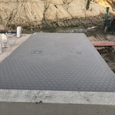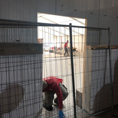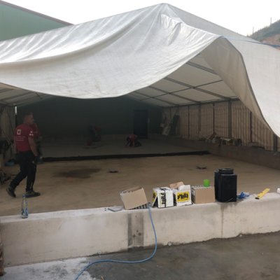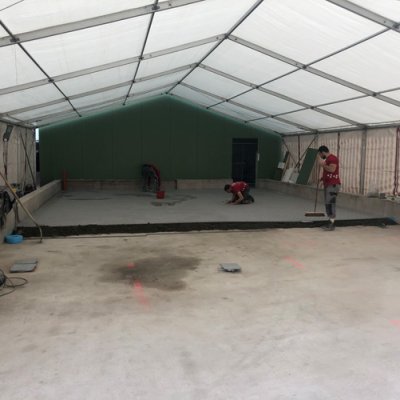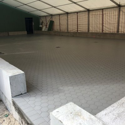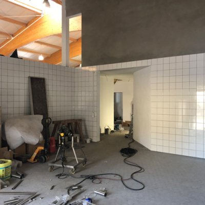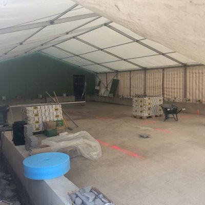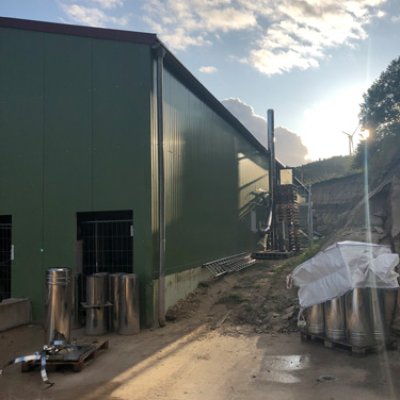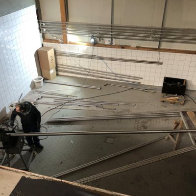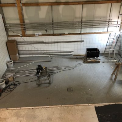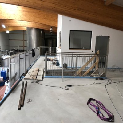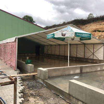 Nach 4 Wochen Wartezeit (das Betonfundament musste erst komplett aushärten) wurde dann ein Zelt aufgerichtet. Das musste gemacht werden, da Regen für die Woche gemeldet war, in der die Fliesenleger den Rüttelboden für das neue Sudhaus legen wollten. Und das war dann auch so. Also alles im Plan :-) Der Rüttelboden wurde dann in den Bereichen Sudhaus und Treberplatz verlegt, zudem das Edelstahlgeländers auf der Empore im Anbau aufgestellt.