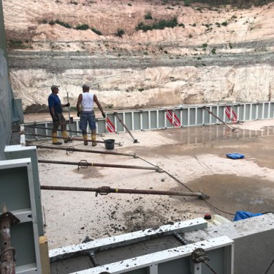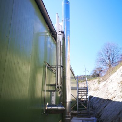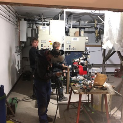 Edelstahlkamine für die Dampfkessel wurden errichtet und die zwei bestehenden Dampfkessel ins neue Kesselhaus gebracht.