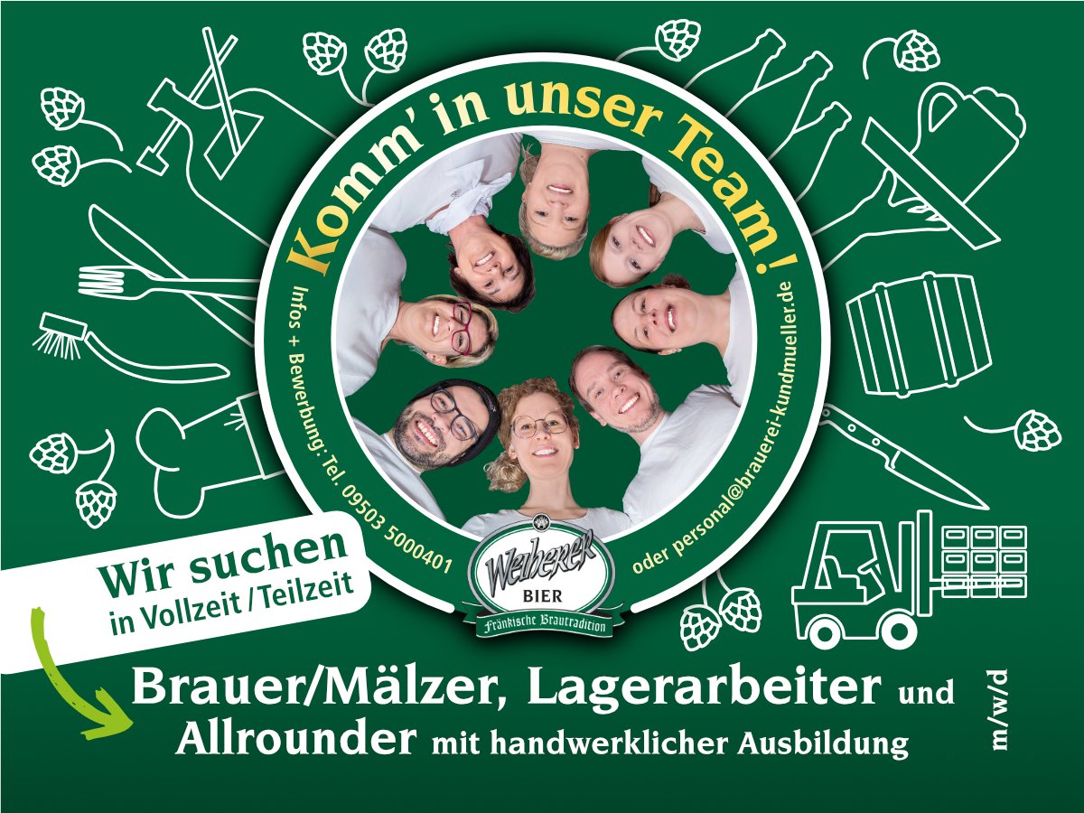 Wir brauen bei uns nicht nur mehrfach ausgezeichnete Bierspezialitäten, sondern überzeugen auch mit fränkischer Küche, idyllischem Biergarten, Biermuseum, Kinderspielplatz, Streichelzoo, Gästezimmern und bierigen Ferienwohnungen und einem wirklich tollem Team! Wir freuen uns auf deine Bewerbung, entweder per mail an personal@brauerei-kundmueller.de oder unter 09503 5000401 oder klicke einfach hier.