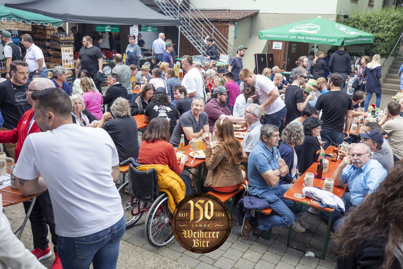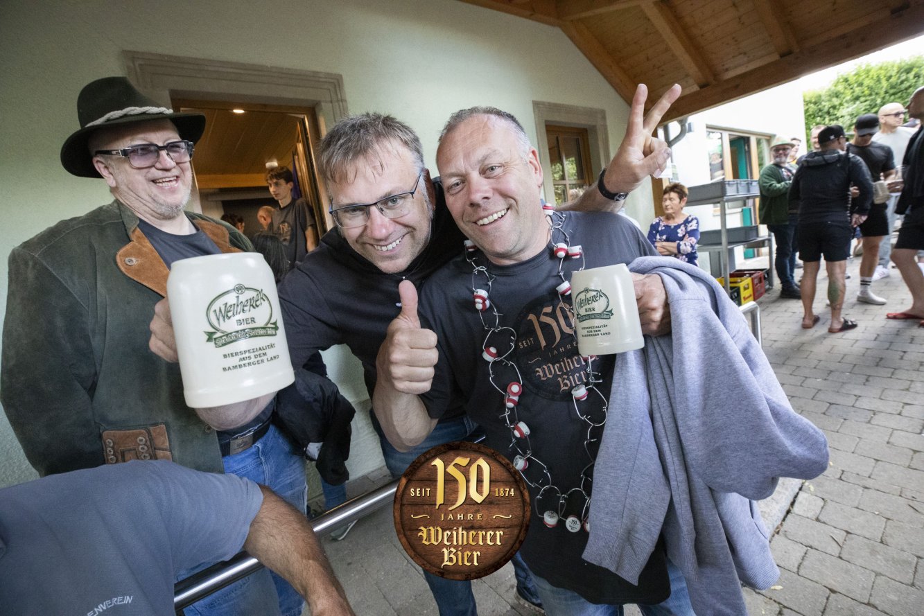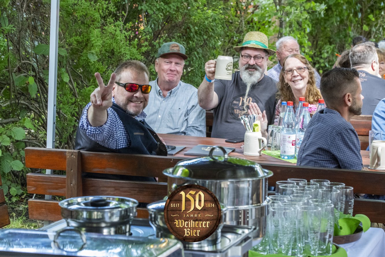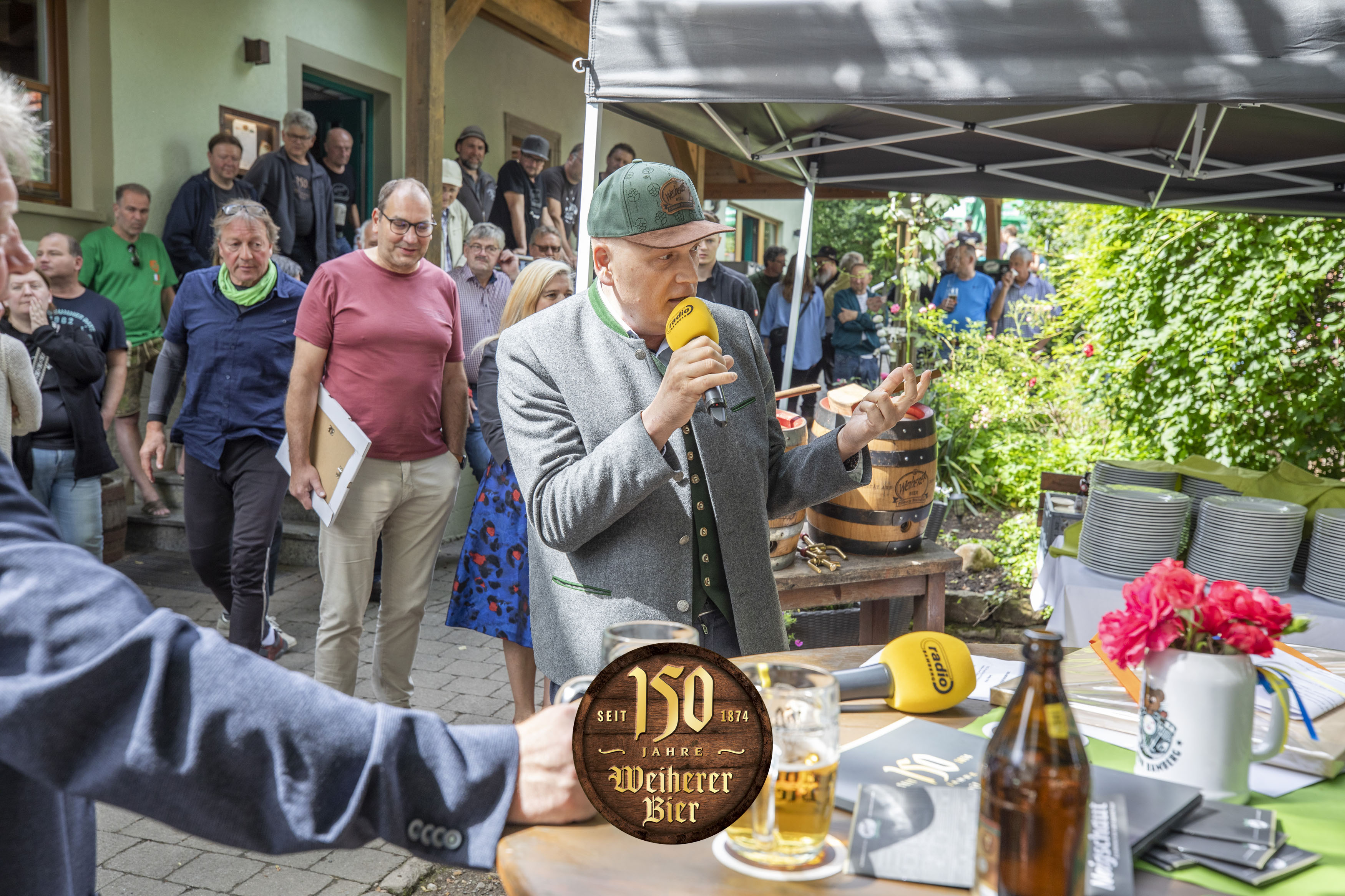 150 Jahre Weiherer Bier – was für ein Jubiläum und was für ein Fest! Unglaublich wie viele Bierfreunde vom 14. bis 16. Juni zu uns nach Weiher gekommen sind, um das große Jubiläum mit uns zu feiern. Stammgäste, Ehrengäste, Kunden, Freunde und Collaboration-Partner von nah und fern reisten an und erlebten ein spektakuläres Wochenende. Schon zum Start am Freitag war der Wettergott gnädig. Regnete es fast die ganze Woche, so spitzte bereits am ersten Festtag abends die Sonne durch die Wolken. Die ersten Gäste reisten bereits kurz vor dem Wochenende an. Allen voran die Collaboration-Partner aus Übersee, Matt Cole von der Fat Head's Brewery in Cleveland, Ohio und Alexandre Bazzo von der Cervejaria Bamberg aus Brasilien, die mit Freunden und Familie über mehrere tausend Kilometer zu uns nach Weiher kamen. Diese waren es auch, die gemeinsam mit dem Duo „M&M“ unseren Brauereihof stimmgewaltig mit Gesang füllten. Nicht nur das bekannte „Prosit“ schallte mehrmals, auch deutsche und internationale Volkslieder wurden – mehr oder weniger textsicher – gemeinsam gesungen. Ein Auftakt nach Maß!