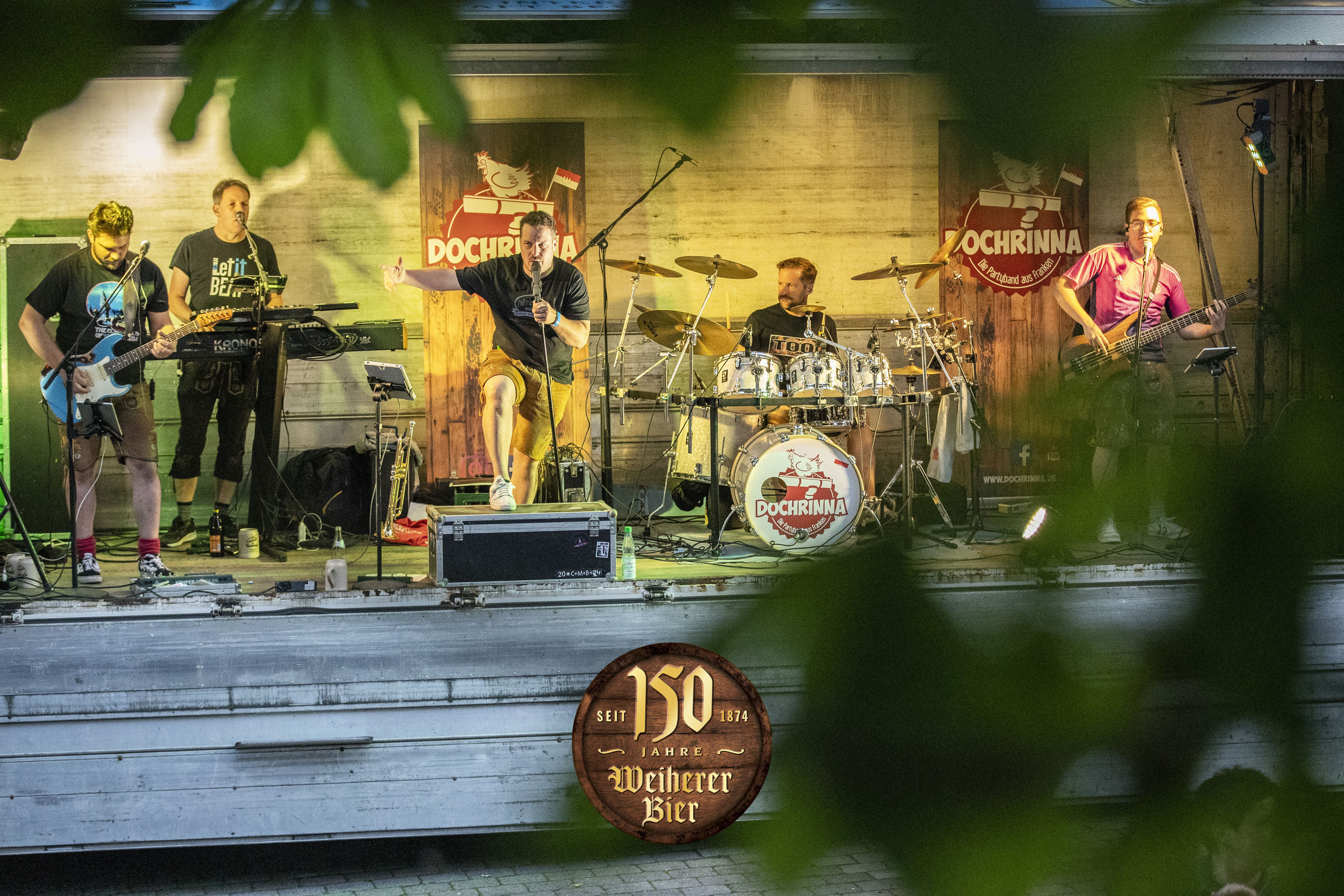 Nach dem Festakt und den Reden gab es den eigentlichen Star des Abends: Der Sondersud „Weiherer Festbier“ wurde gleich von zwei ehemaligen Bierköniginnen gemeinsam angestochen. Unter lautstarker Anfeuerung des Radio Bamberg-Duos Fabi und Stego, die live aus Weiher sendeten, zeigten Sabine Bergert und Melanie Streit, wieso sie zu Recht die Krone tragen durften. Sie zapften gekonnt das erste Bier, das die Gäste mit allerlei bekannten Weiherer Leckereien, wie Bierbrauerbraten, Schäuferla und Haxen in Biersoße genießen durften. Bevor am Abend des zweiten Festtages die fränkische Kultband „Dochrinna“ direkt aus einem Weiherer LKW die Menge begeisterte, war es noch Zeit für den Segen von ganz Oben: Pfarrer Christian Montag weihte in einer wunderbar kurzweiligen Art die neue Gastro-Küche und den neuen Flaschenfüller unserer Brauerei ein.