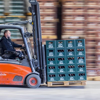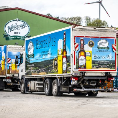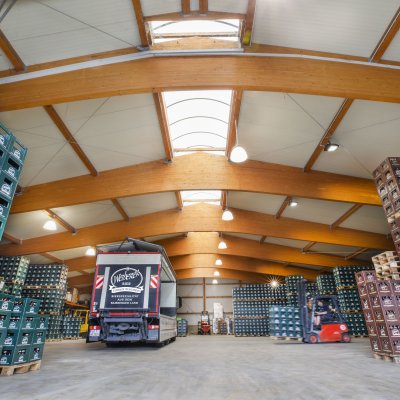 Direkt oberhalb der Brauerei befindet sich das 1200 Quadratmeter große Logistikzentrum. Unsere Lkws und Transporter beliefern von dort aus die rund 300 Getränkemärkte und Gaststätten in ganz Franken. Im Logistikzentrum befinden sich auch unsere Kühl- und Ausschankwägen, die wir gerne für Feste vermieten.