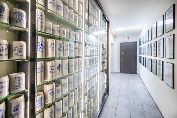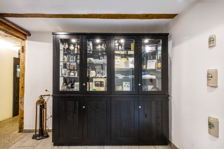 Im Gang der Gaststätte Richtung WC befindet sich ein Teil unserer Bierkrugsammlung. Über 350 historische Bierkrüge sind hier zu sehen und einige andere alte Brauerei-Utensilien.